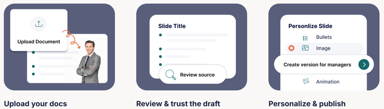 Turn technical docs input into accurate, trusted enterprise courses for subject matter experts in minutes, using deep referencing and validation to ensure content quality, traceability, and compliance.